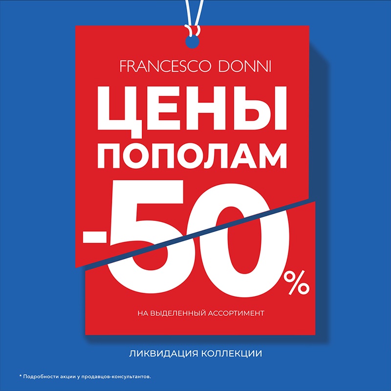 В магазинах Francesco Donni стартует ликвидация коллекции: на весь ассортимент прошлых сезонов скидка 50%, на товары новой коллекции скидка до 30% плюс 20% на второй