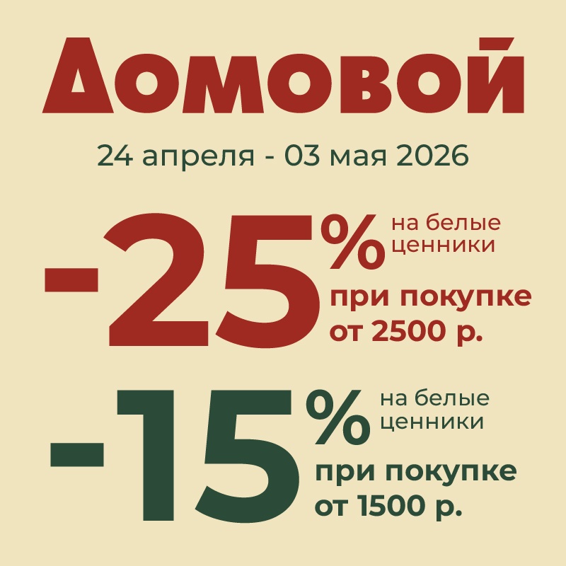 Акция действует с 24.04.26г. по 03.05.26г. В розничных магазинах «Домовой» предъявите на кассе перед оплатой покупок купон, размещенный в сообществе «Домовой» в Телеграм, MAX или ВКонтакте и дисконтную карту «Домовой» с 24.04.2026 г. по 03.05.2026 г. и получите скидку 15% при покупке от 1500 руб. или скидку 25% при покупке от 2500 руб. на товары с белыми ценниками.
